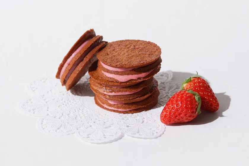 カリッと焼き上げたチュイールクッキーに甘酸っぱいいちごチョコレートをサンドした、5層仕立てのクッキーです。