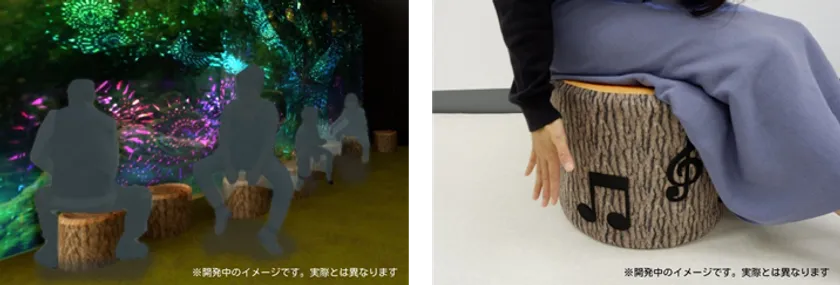 「MELODY STUMP/楽器の森の切り株」は、切り株型の椅子に座って音楽記号の模様を手で叩くと、木琴や太鼓などさまざまな音を奏でることができる、タッチセンサーを活用した音楽アトラクションです。いろいろな音を試してみたり、家族や友だちとセッションをしてみたり、遊び方は自由自在。まるで絵本の世界に入り込んだかのようなファンタジックな体験が楽しめます。