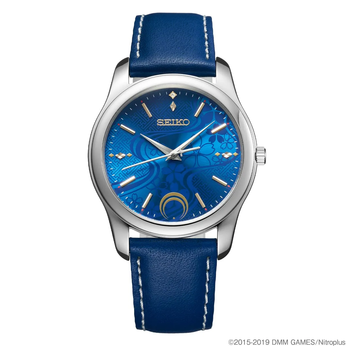 三日月宗近の衣装になぞらえた青き文字盤を、桜の花びらがはらはらと舞い散り、紗綾形の地紋が優雅な印象を演出します。