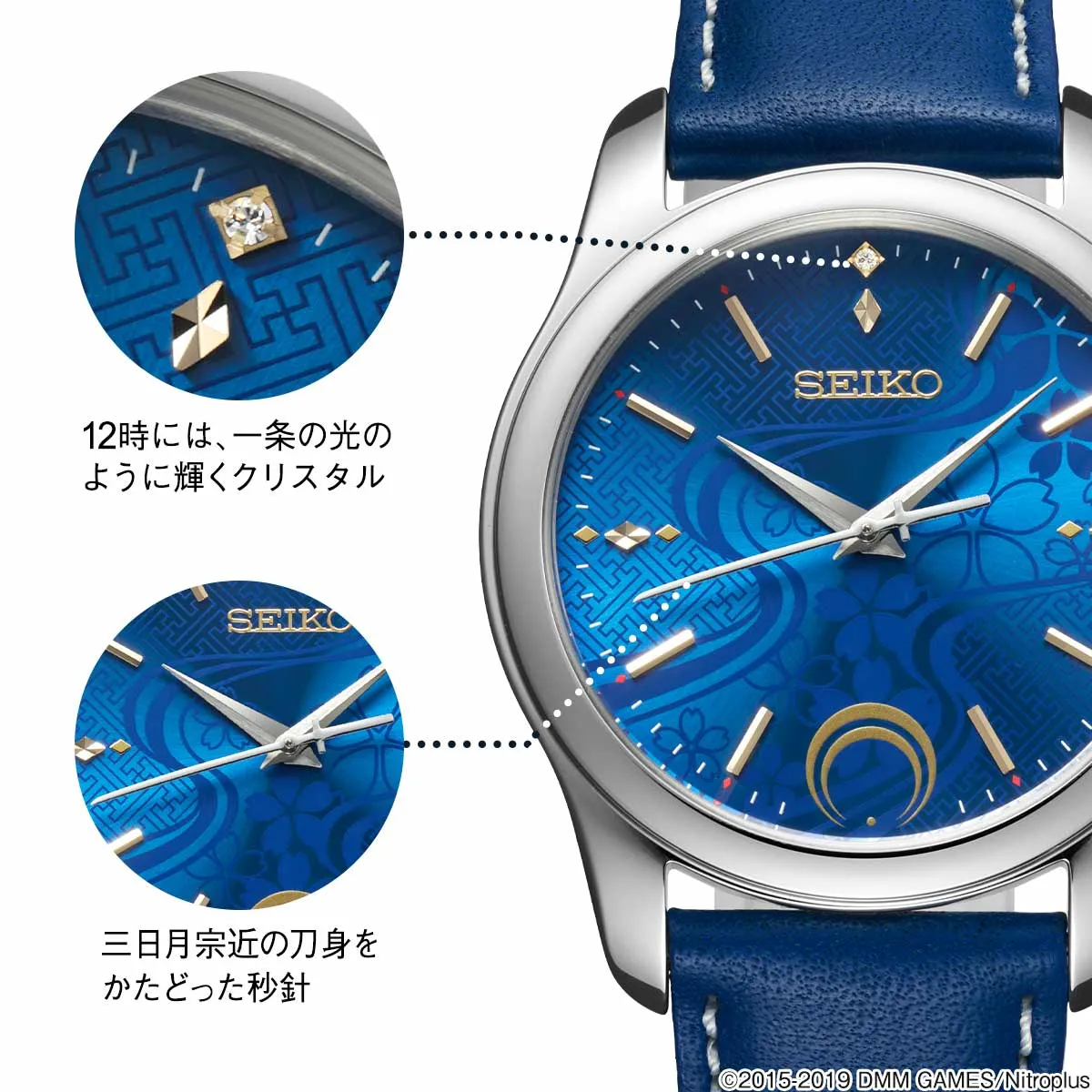 三日月宗近の衣装になぞらえた青き文字盤の12時位置には、一条の光のように輝くクリスタルを配置。