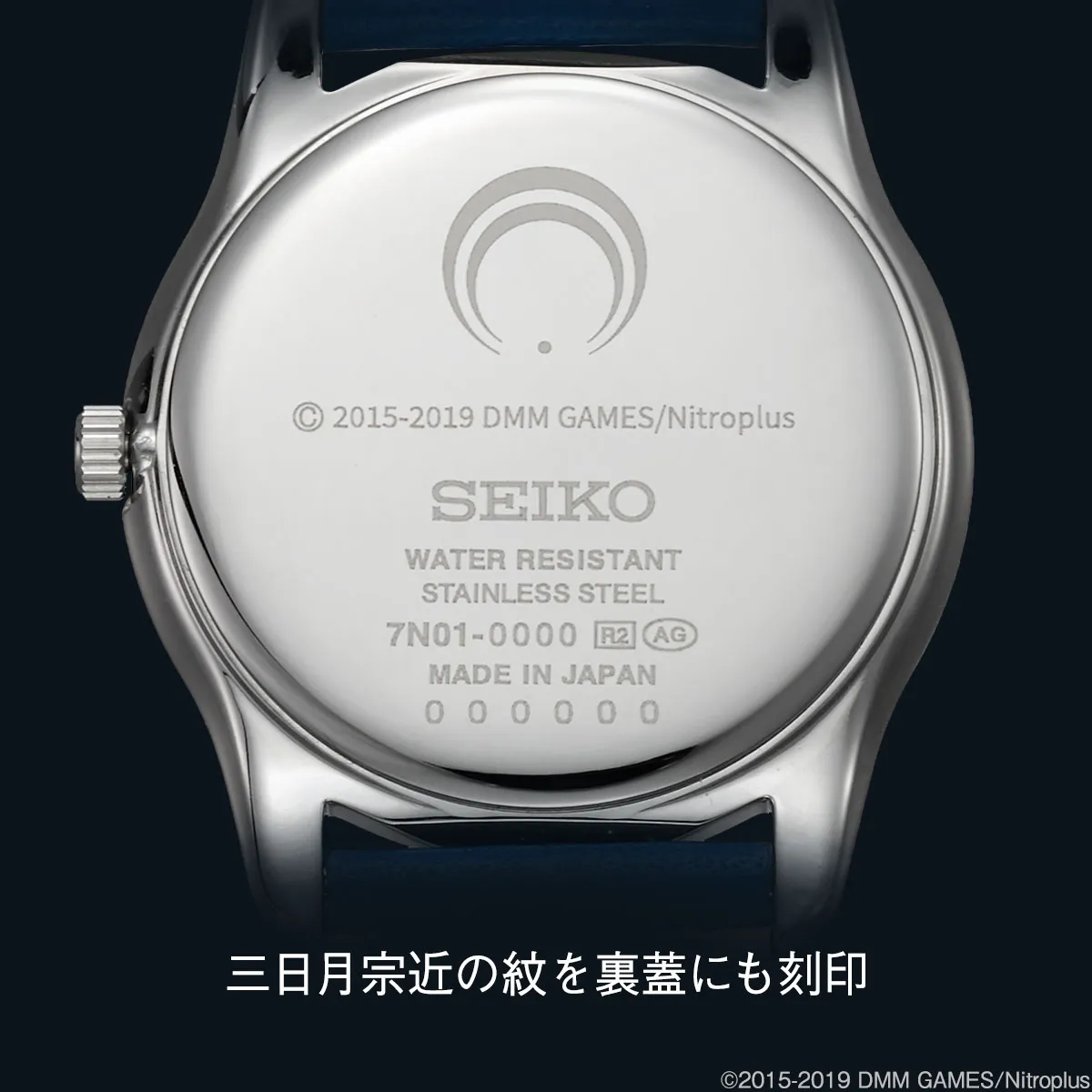 刀に刻まれた銘さながらに、三日月宗近の紋とセイコーのロゴが裏蓋に刻印されます。