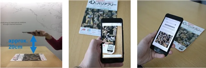 また、視覚障碍における世界共通の課題のひとつが、健常者と比較して情報の取得手段が限られてしまう事です。(特に印刷物からの情報取得に困難を伴います)この問題を解決する為には、視覚障碍者自身が情報を得やすくする為の工夫と共に、情報を出す側が、視覚障碍者に受取りやすい情報を簡易に発信できるようにする工夫が必要となります。そこで、すでに世界中で普及しているQRコード(※1)を利用し、印刷物の文字情報をそれぞれの言語で音声化させる事が出来れば、視覚障碍者が取得可能な形で情報を発信出来る割合は飛躍的に高まるのではという考えから今回の取組みはスタートしました。