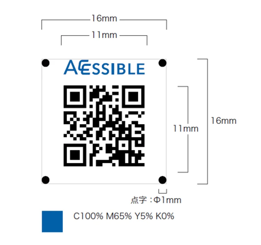 ・QRコードの4隅の余白部分に、直径約1mmの点字上の突起(点字のJIS規格と同じ仕様)を配置する。もしくは余白部分を囲む4辺を窪地(凹)にしてQRコードの存在を明示する。