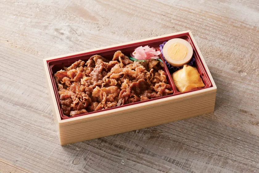 茨城のブランド牛「常陸牛」をすき焼き風のしっかりした甘めのタレで味付けし、肉と玉ねぎとのバランスが絶妙な弁当。付け合わせの煮たまごや里芋と鶏の湯葉包みも箸休めにぴったり。