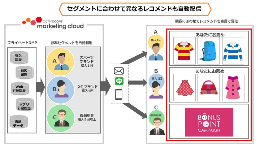 (※2)MAセグメント配信:「activecore marketing cloud」内に蓄積している顧客属性・行動データに基づいてセグメントを判別し、メール・LINE・アプリでの一括配信時に個人にあわせてコンテンツを出し分けられる機能。