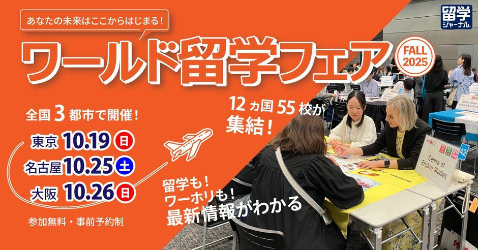 株式会社留学ジャーナル(本社:東京都新宿区、代表:横山健一)は、10月に東京・名古屋・大阪の3都市で「ワールド留学フェア FALL 2025」を開催。世界12ヵ国55校の教育機関が参加し、直接相談や多彩なセミナーで留学に関する情報を提供します。入場は無料です。