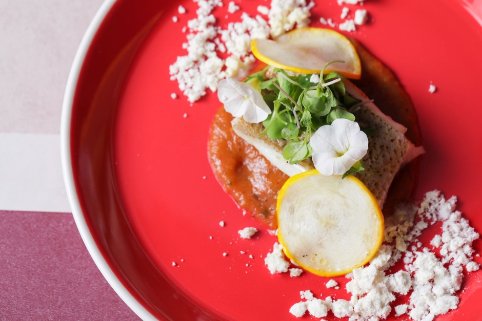 チャンジャとエリンギのペペロンチーノ(イタリア×韓国)/本日のパスタ(イタリア)/旬魚のロースト カポナータのピュレとタプナード(イタリア)/白身魚のフリット 青ネギと韮とヤンニョムソース(韓国)
