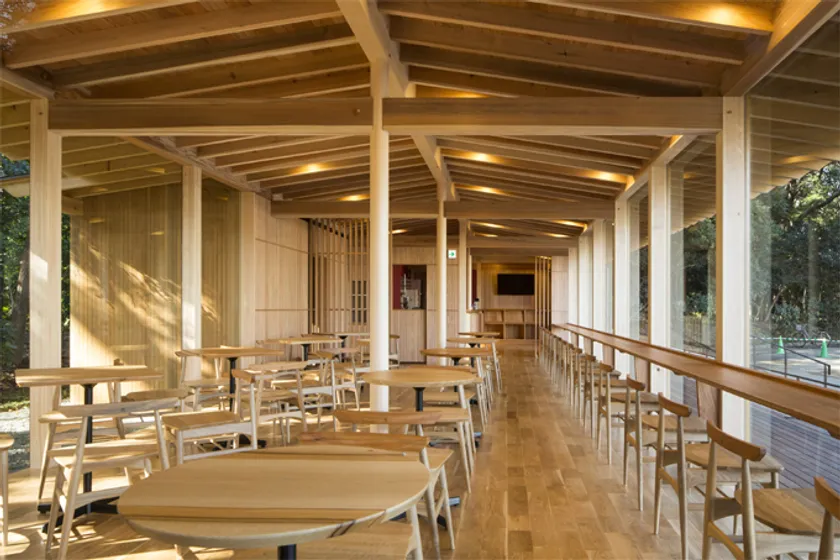 明治神宮の杜との一体感を感じられるよう、木部には国産材と明治神宮御造営時の献木の枯損木も利用しました。明治神宮の杜のコンセプト「再生・循環」を感じる店内で、参拝後のひと時をお過ごし下さい。