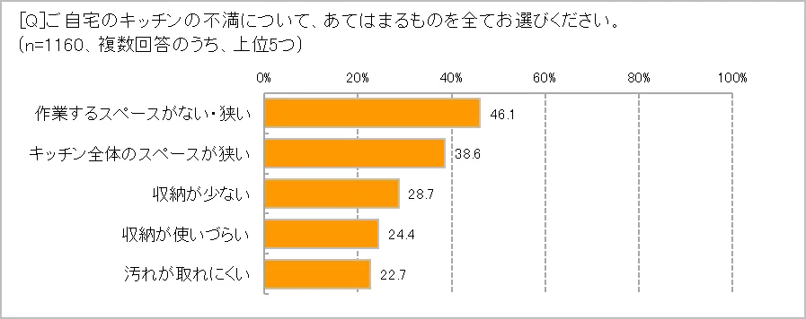今使っているキッチンへの不満第1位は「作業スペースが狭い」46.1%