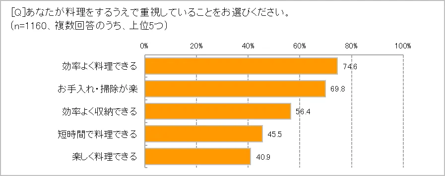 今使っている自宅のキッチンについて、不満に思っていることを聞いたところ、1位は「作業するスペースがない・狭い」46.1%。キッチン全体の狭さや、収納の量、使いにくさにも票が集まりました。料理をするうえで重視していることの上位には、「効率よく料理ができる」74.6%、お手入れ・掃除が楽」69.8%、「効率よく収納できる」56.4%がランクイン。求められているのは、「効率」と「楽」のようです。