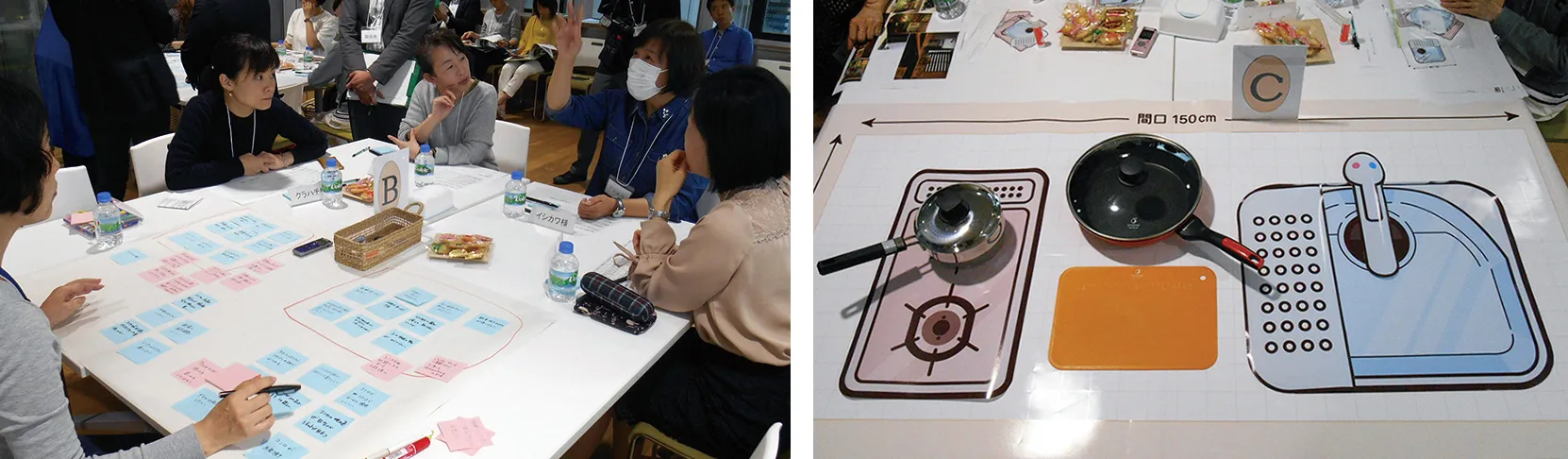 今回は、ひとり暮らし向けのマンションのキッチンがテーマのため、キッチン自体のスペースは幅150cmと限られています。その中で、作業スペースを確保して効率よく料理できるようにするにはどうしたらいいか……。現在ひとり暮らしのかたや経験者に集まっていただき、開催したワークショップでは、その課題を解決するために、あらためてキッチンの不満点を洗い出したり、実物大の設備をイメージしたパーツを組み合わせたりしながら、いろいろな意見を出し合いました。