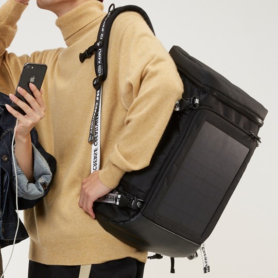 ウェアラブル発電時代の到来!バックパック背面に搭載されたソーラーパネルでデジタルデバイスを充電することができます。約4時間の太陽光照射でスマホをフル充電することが可能です。