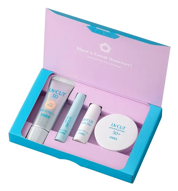 SPF50、PA+++の効果と、軽くなめらかなテクスチャーを兼ね備えた、メイク下地としてもおすすめの「UVカット50<ティントベージュ>」本品サイズに、「UVカットプレストパウダー50+<ラベンダー>」「UVカットミルク50+」のミニサイズ、唇にうるおいを与えながら、紫外線からガードする「UVガードリップスティック(シアーコーラル)」のお得なセット。