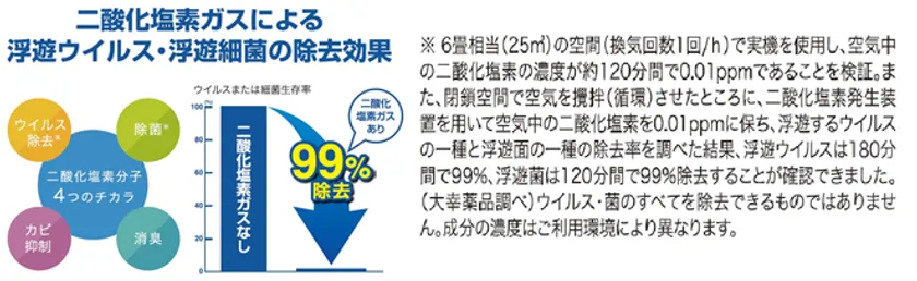 「CLGU-061」「CLGU-062」は、大幸薬品株式会社がウイルス除去・除菌・消臭製品「クレベリン」シリーズで培った技術を基に開発したスイッチのオン・オフで二酸化塩素の発生をコントロールできる「クレベリンLED」を組み込んだ二酸化塩素の発生機です。「クレベリンLED」を活用し、空間を除菌・消臭します。二酸化塩素は、液剤としても使用されており、現在一般的に使用されている次亜塩素酸ナトリウムと比べ効率よく作用し、安全性の高い成分として注目を集めています。