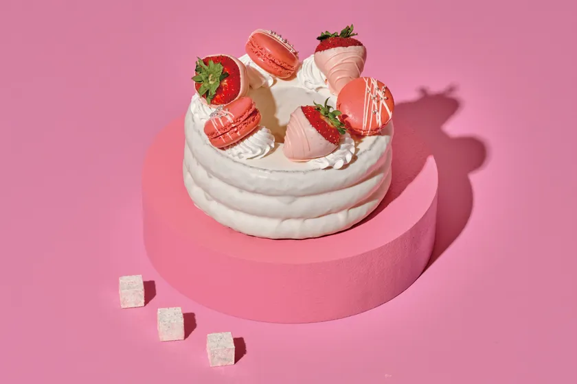 苺のバームクーヘンをホワイトチョコレートでコーティングしたスウィートなミニケーキ。ストロベリーマカロンとチョコレートにディップした苺を飾り付けた、フォトジェニックな一品です。