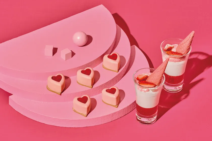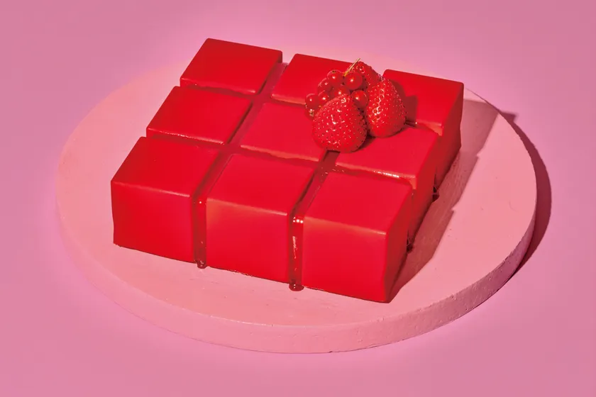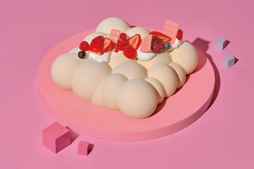 パッと目を引くビジュアルは、キューブのおもちゃから着想を得ています。ラズベリームースの中にカシスのゼリーを忍ばせました。ラズベリーの酸味を効かせ、さっぱりと仕上げました。