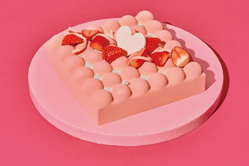 苺のクリームを使用したショートケーキを、苺のバタークリームでコーティングした、ポップなハート型ケーキです。カットすると、中からストロベリーとハート型のチョコレートがこぼれ落ちてきます。