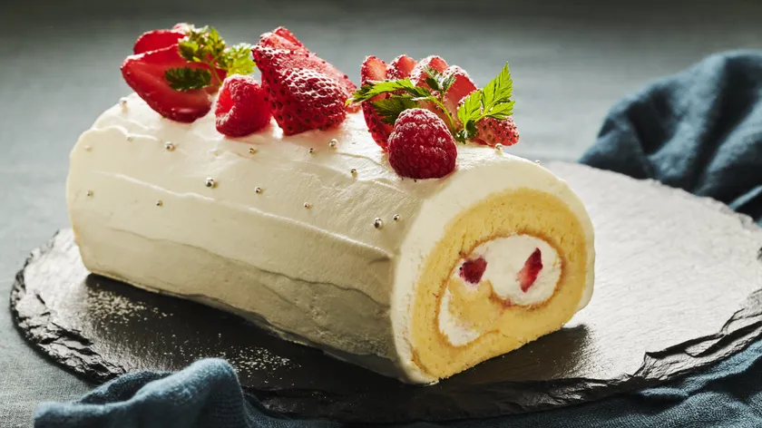 しっとりとキメ細かいシフォン生地でたっぷりの生クリームを巻き、苺を飾ったロールケーキです。
