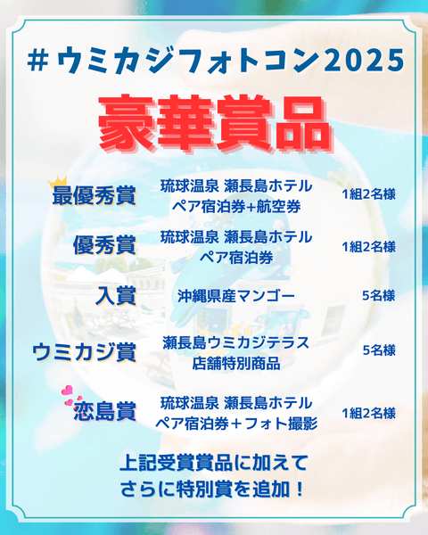 受賞者には様々な豪華賞品を用意しており、“恋の島” にちなんだ『恋島賞』も用意していますので、ご来場の際にはぜひ写真を撮影してご参加ください。