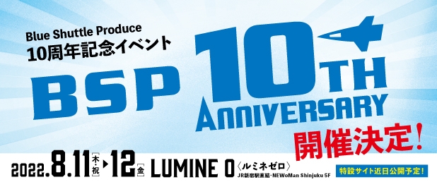 劇団ひまわり(代表取締役:砂岡 誠)主催、Blue shuttle produce 10周年記念イベント『BSP 10th ANNIVERSARY』が2022年8月11日(木・祝)~8月12日(金)にLUMINE 0〈ルミネゼロ〉(東京都渋谷区千駄ヶ谷五丁目24番55号 NEWoMan Shinjuku 5F)にて開催されます。