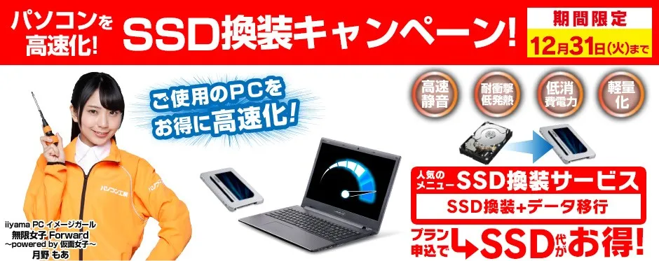 パソコン工房・グッドウィルを運営する株式会社ユニットコム(代表取締役:端田 泰三、本社:大阪市浪速区)は、人気のパソコン高速化サービス「SSD換装サービス」(換装作業・データ移行作業)の利用で、SSD部品がセットでお得になる「パソコン高速化!SSD換装キャンペーン」を全国のパソコン工房・グッドウィル店舗にて期間限定で実施いたします。