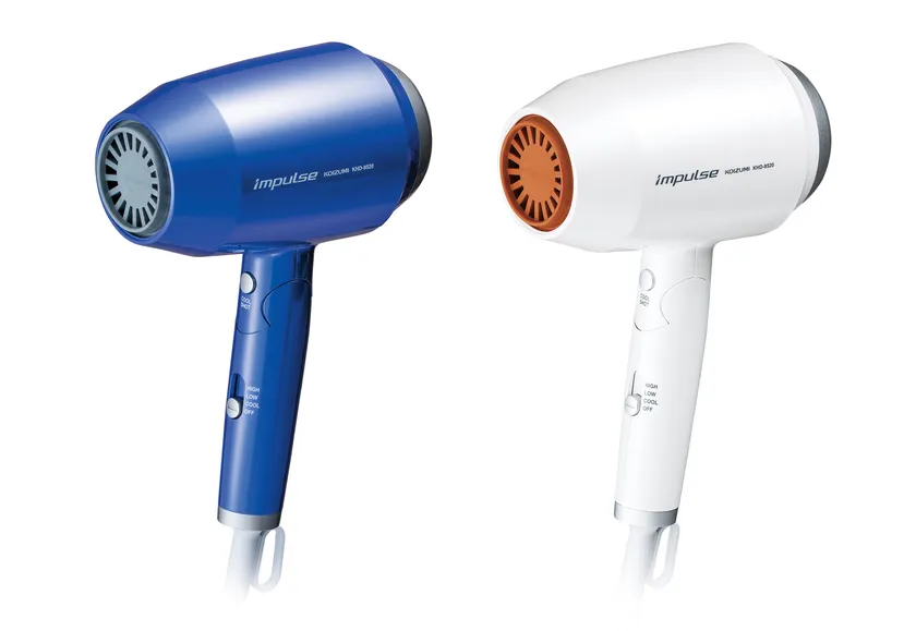 「ジェットスピードドライヤー インパルス」(KHD-9520/A・W)は、ハイパワー1,300Wを採用。最大風速約105km/h(※)の高風速で、水滴を吹き飛ばして速乾性を高めます。その他機能にツインマイナスイオン発生、低温風で髪と地肌をケアするスカルプモード、押している間だけ「COOL」の風に素早く切り換るクールショットボタンを搭載。着脱式吸込口カバーでお手入れも簡単です。
