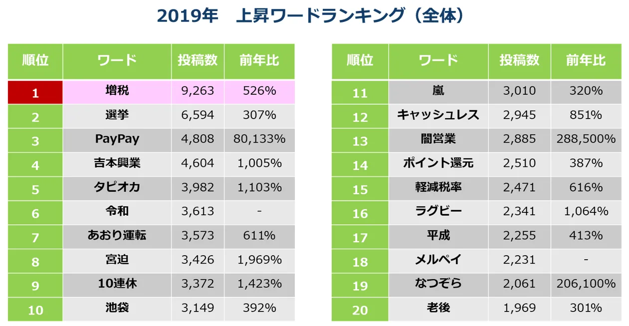 次いで、「選挙」「PayPay」「吉本興業」「タピオカ」などが続いており、今年話題となった出来事や商品サービスが続く形となりました。