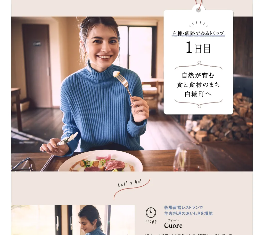 広大な大地と果てしない海、どちらの魅力も満喫できる白糠町にはおいしいものがたくさん。町内随一の観光スポット「恋問海岸」で雄大な太平洋を眼前にこの地の風を感じ、「すっごい気持ちいい!」と歓声をあげたマギーさん。レストラン「Cuore」の羊肉を食し、タイミングによってはできたてのモッツァレラチーズが食べられる「白糠酪恵舎」でチーズを購入するなど、白糠が生んだ美食たちに出合う旅にでかけます。「本当に“食材王国”なんですね! 聞くだけでテンションが上がります。」お隣、釧路市には広大な「釧路湿原」が広がり、冬を感じるドラマチックな景色が訪れる人の心をつかみます。「釧路市丹頂鶴自然公園」や「釧路市動物園」で、北の動物たちに挨拶するのも忘れずに。たんちょう釧路空港から気軽にアクセスできるこのエリアで、ゆるり冬の旅を楽しみましょう。