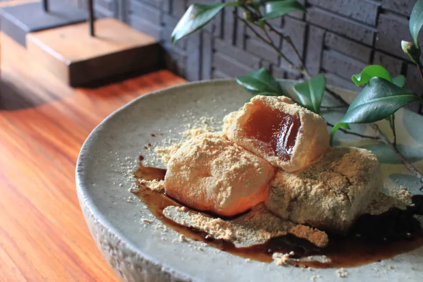長時間かけて手煉りでじっくり煉り上げられた、上品な味わいのわらび餅。厳選した国産素材と由布院の天然水を使っており、繊細な食感でとろける口どけ。