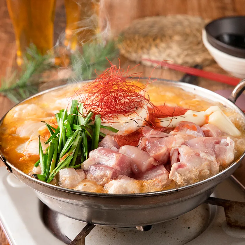 キムチや明太子の辛みとうま味に、カマンベールチーズととろろのねばりと濃厚さが交わった絶品鍋。炊き続ける事で、溶け出すチーズや明太子のうま味が混じり合い、柔らかな鶏もも肉に絡んでほくほく熱々。この冬女性にも大人気のお鍋です。