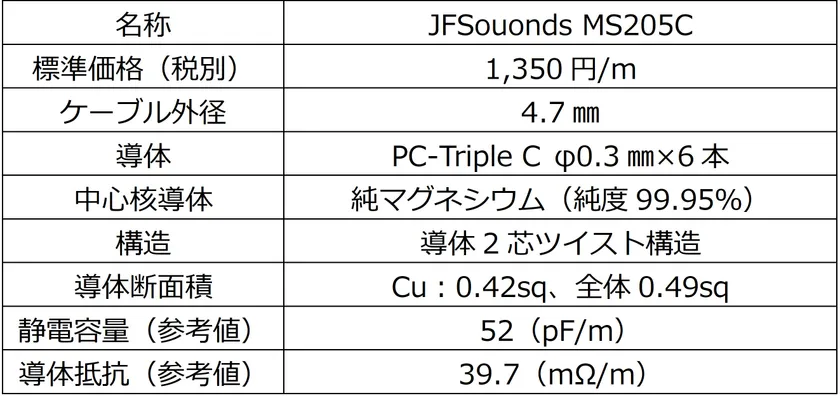ジャパンファインスチール株式会社(所在地:山口県山陽小野田市、代表取締役社長:長尾 浩司)は、制振効果の高い「純マグネシウム」を導体芯に使用したスピーカーケーブル「MS205C」を、音響ブランド「JFSounds」から販売開始いたしました。