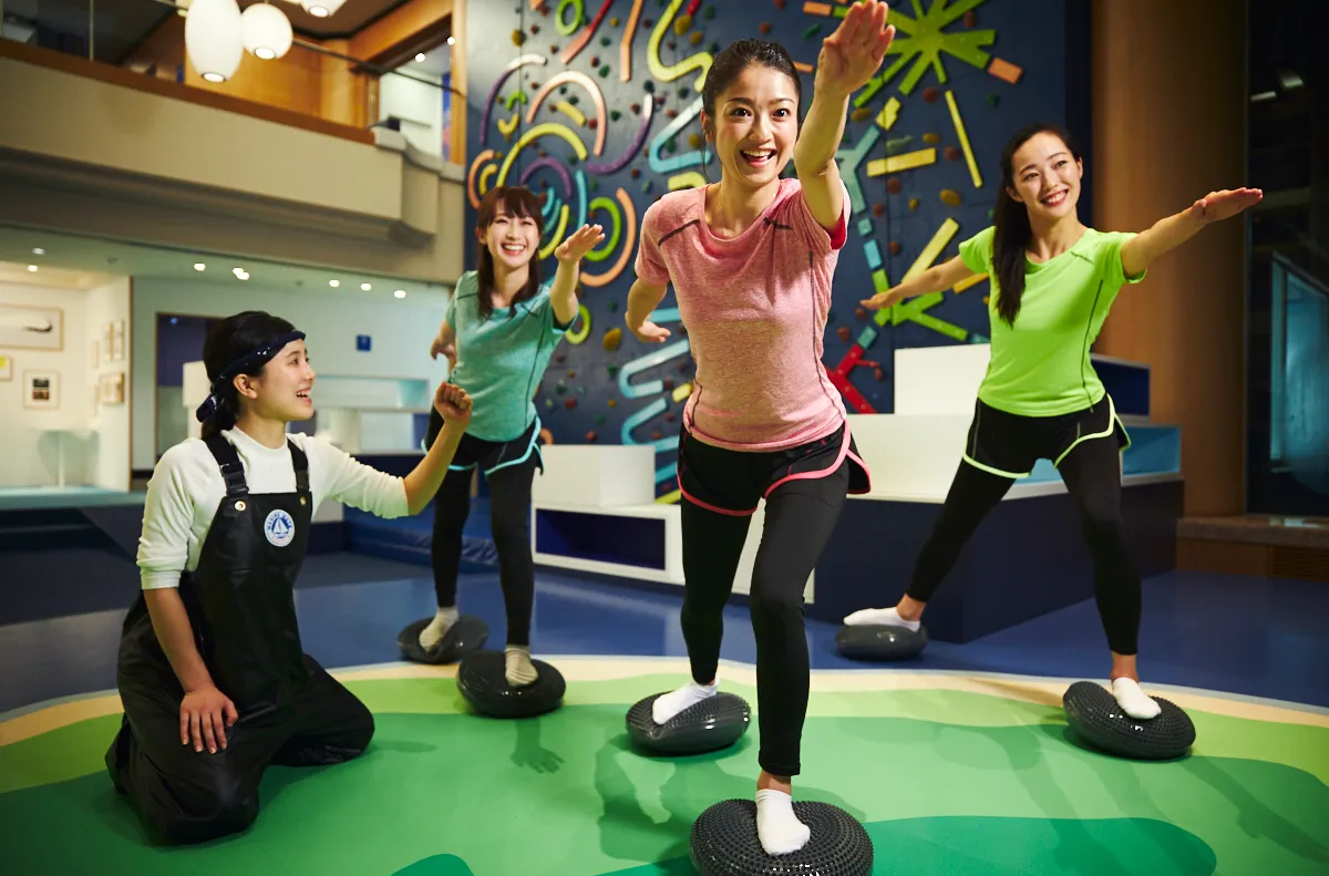 スタッフが考案したオリジナルのウォーミングアップでは、漁に備えて身体を動かします。不安定な船上でバランスを保つためのバランスディスクを使った運動や、館内にある高さ6.5メートルのクライミングウォール「親子の北壁」で、網を引く力をつけるためにクライミングを行います。