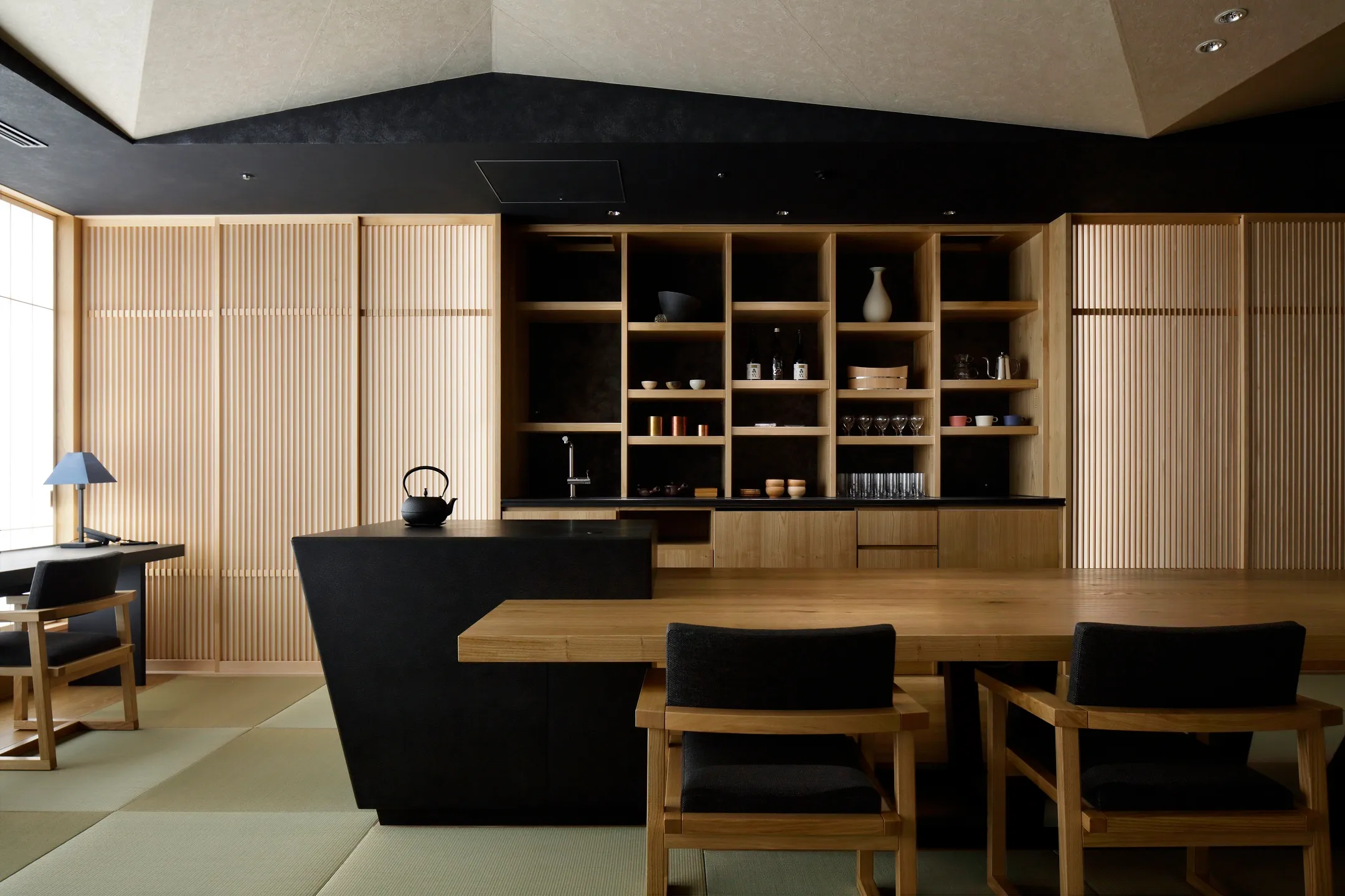 「塔の日本旅館」をコンセプトに2016年7月に開業。玄関で靴を脱ぎ、畳敷きの伝統的な和室や各階のお茶の間ラウンジ、最上階に温泉を備える星のや初の都市型旅館。