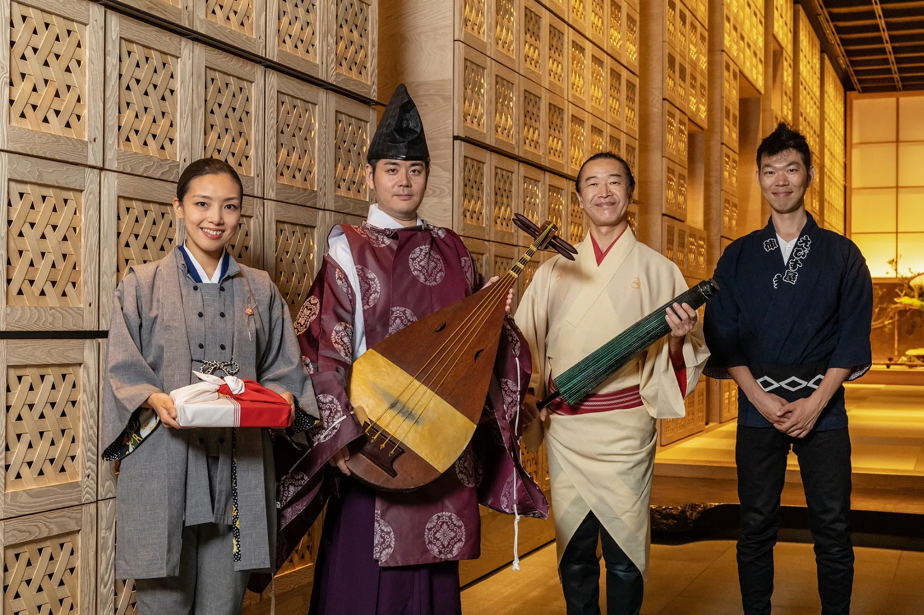 星のや東京ならではの祝いを演出する専任のスタッフ「言祝ぎさん」が、予約の段階から、祝いに合わせた空間の飾り付けや贈答品、食事の内容、催し物の提案を行い、滞在が思い出に残るものになるよう、様々な形でサポートします。