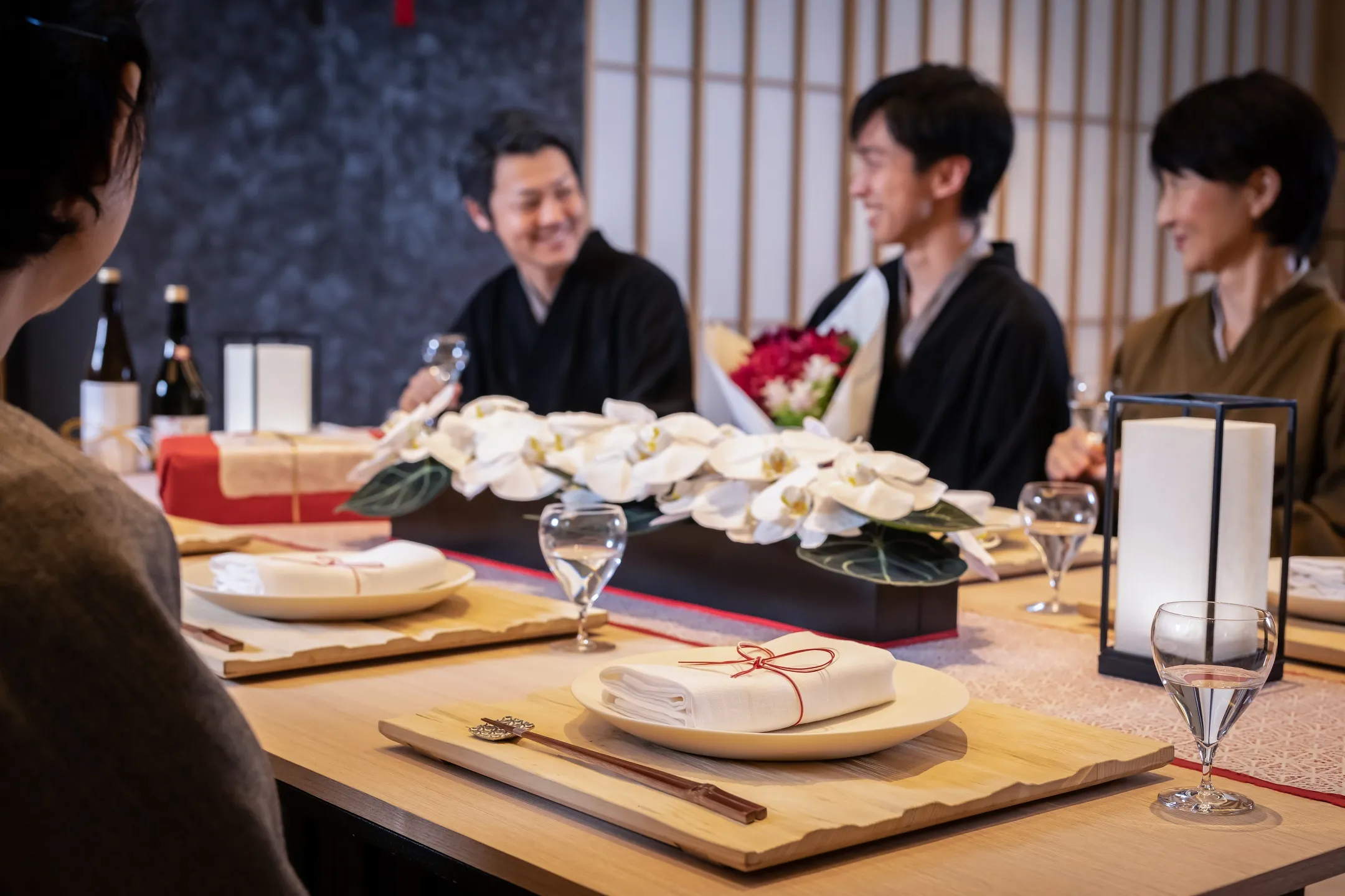 祝いの内容や時間帯に応じて、お茶の間ラウンジの空間全体を室礼や照明で彩り、家族のための特別な場を盛り上げ、大切な祝いの時間をより一層思い出深いものにします。夕食時にはお茶の間ラウンジに、家族のためだけに一から仕立てられた祝い重や、祝いに合わせたお酒を用意します。祝い重には、日本各地の旬の食材や縁起の良い食材をふんだんに使用します。華やかに飾り付けられた中央の大きなテーブルを囲みながら、時間や人目を気にすることなく、家族だけの語らいの時を過ごすことができます。