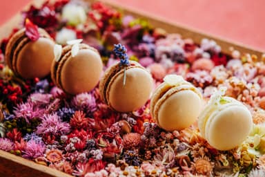 ガナッシュ(ショコラクリーム)に含まれるカカオ成分の比率を、82%・70%・60%・50%・0%(ホワイトチョコレート)に変えた、5種類のショコラマカロンです。成分比率が変わると味も変わります。それぞれのガナッシュには、その味に合う花の香りを練りこみました。ひとつ味わうごとに、バラ、ジャスミン、ラヴェンダー、スミレ、エルダーフラワーの華やかな香りに包まれ、幸せな気持ちになります。
