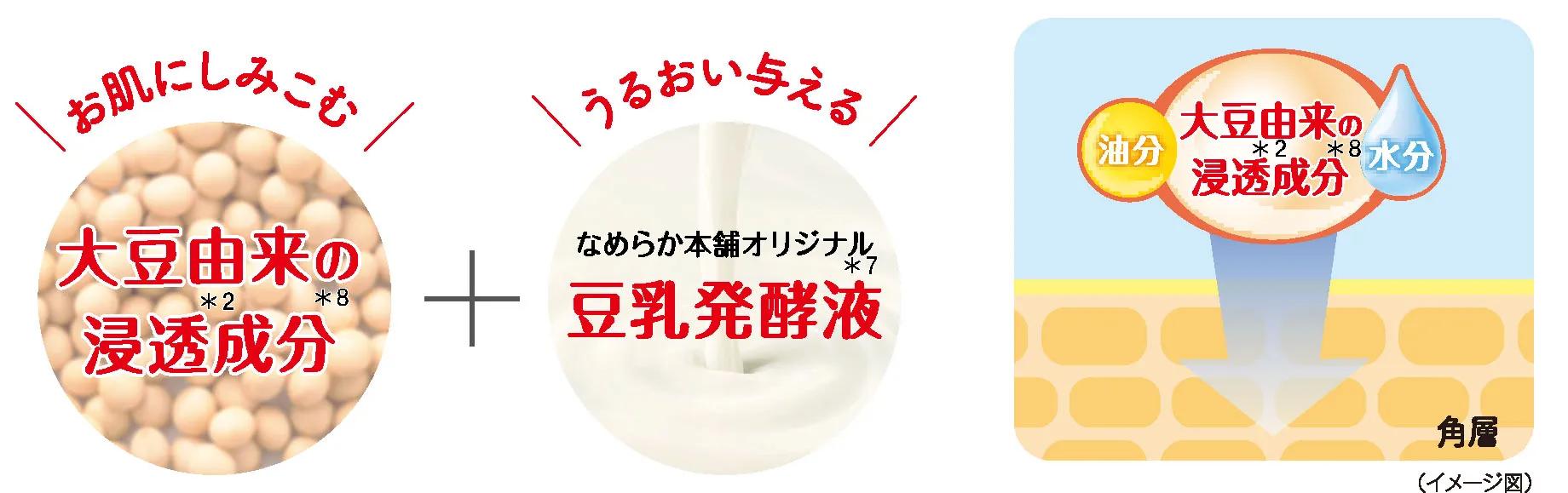 (1)大豆由来の浸透*2成分*8と豆乳発酵液*7を配合し、しっかり保湿