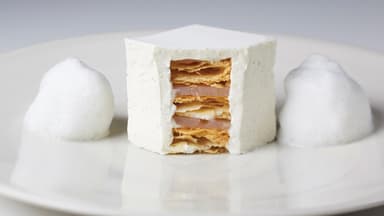 BBCの『マスターシェフ』に出演し、脚光を浴びたアン・ソフィー・ピックは、初のテレビ出演となった本番組で伝統的なミルフィーユを独自にアレンジし、ソーシャルメディアでの話題を席巻しました。かりっとした食感のロイヤル・アイシングのシートに覆われた真っ白な表面を割ると、三層に重ねたサクサクのパイ生地、タヒチ産バニラを使ったクリーム、ジャスミンゼリーの層が表われます。両サイドには貴重なヴィチペリフェリ・ペッパーを数滴たらしたフォームミルクを添えました。純白な外観、軽さと驚きを体現したがデザートは、ミシュラン2つ星レストランの中でもインスタグラムに多く登場した一皿です。