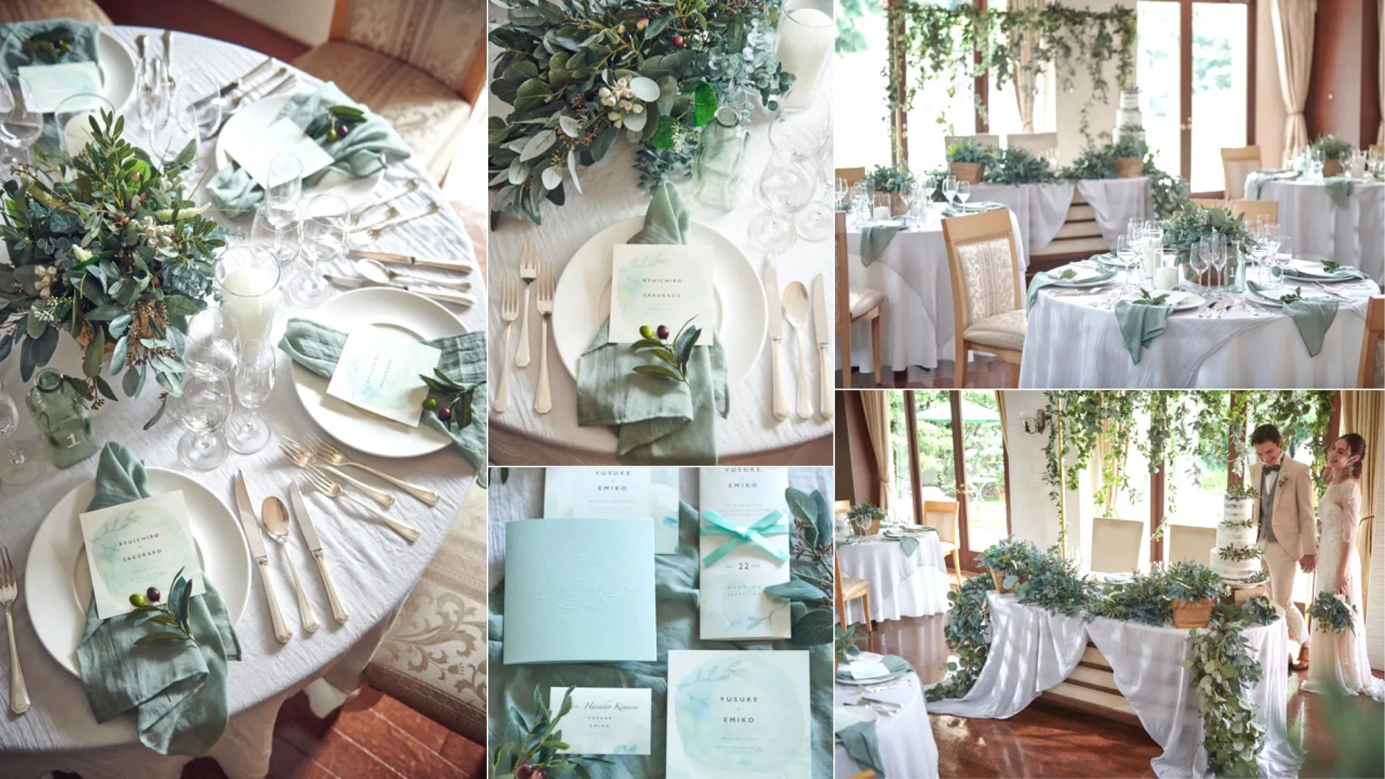「エバー・グリーン」は、セージグリーンとグレーを基調にしたコレクション。“いつまでも色褪せない”という想いを込め、おふたりの変わらない愛を表現します。