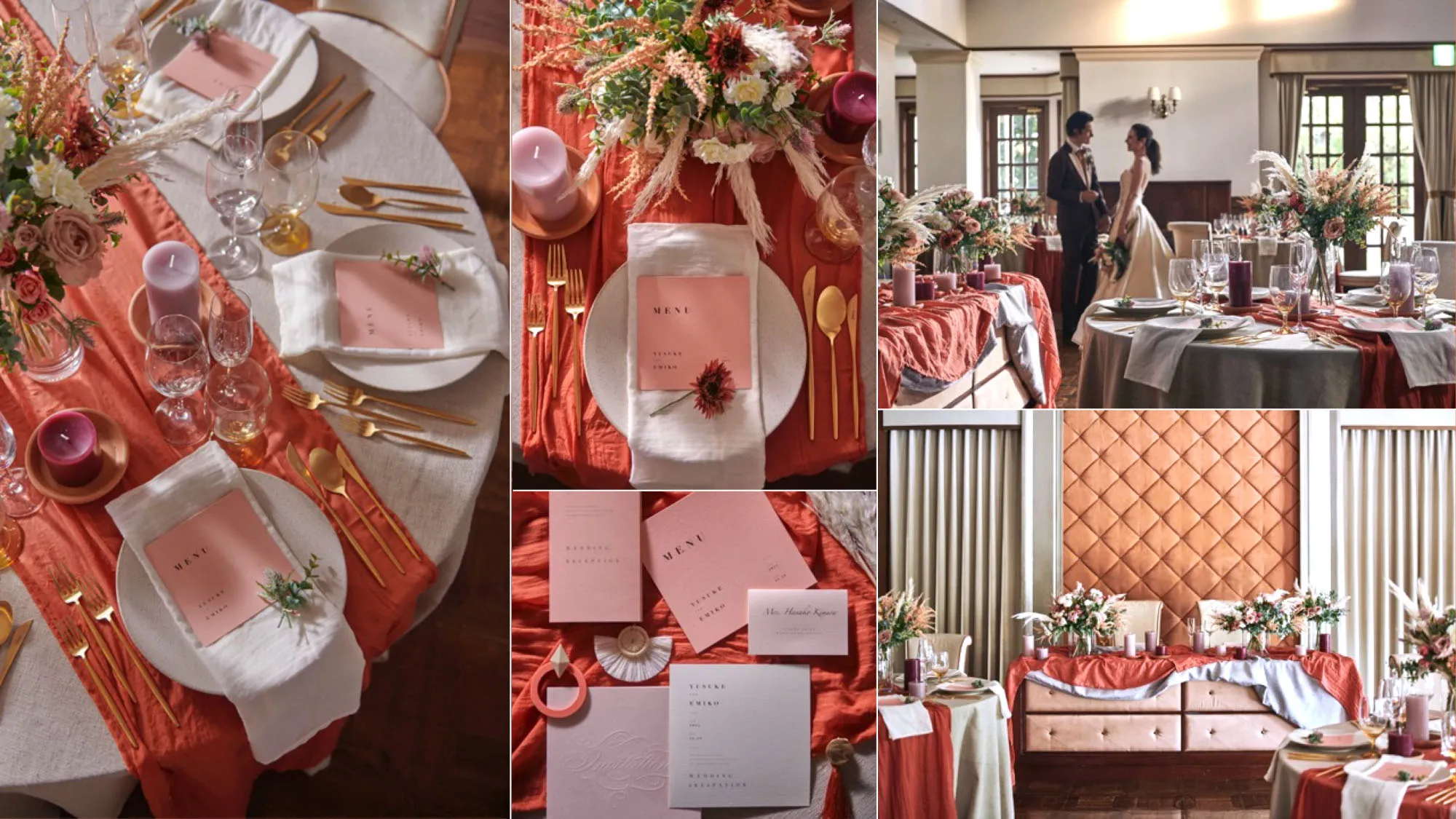テラコッタなど赤茶色のさまざまなニュアンスがベースの、まるで夏の夕陽のような色合いのコーディネート。クロスやナフキン、お皿などのマットな質感とラフなスタイリングは、トレンドに敏感なおふたりにおすすめのコレクションです。