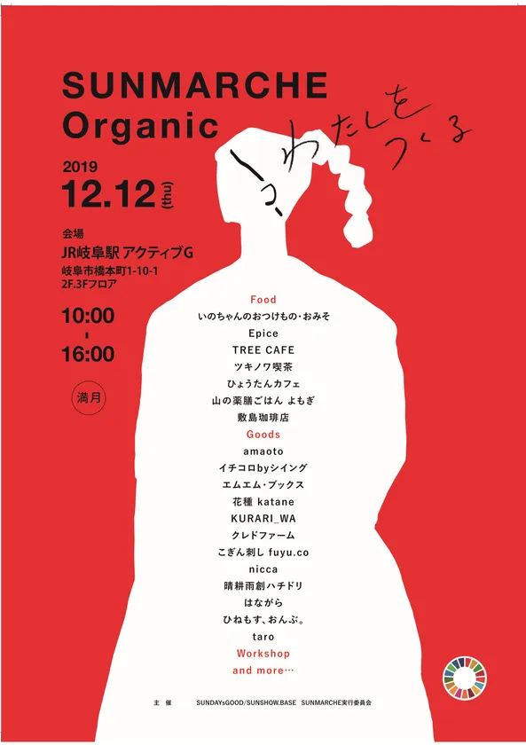 地場の住宅会社、三承工業株式会社(以下:三承工業、本社:岐阜県岐阜市、代表取締役:西岡 徹人)は2019年12月12日(木)にJR岐阜駅に隣接するアクティブGにてオーガニックサンマルシェを開催します。三承工業が展開するSDGs情報発信基地「SUNSHOW.BASE」、SDGsライフスタイルショップ「SUNDAYsGOOD」が主催します。