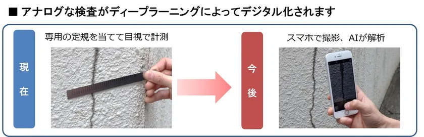 本AI画像診断システムにより、建物検査員が撮影するモバイルカメラの画像から建物外壁や基礎部分のクラックを検知(抽出)し、そのクラックの中から最大幅を特定して計測することが可能となります。この計測されたクラックの幅から対象建物に及ぼす影響などを推測・評価し、その情報を基に売買取引に際して必要な説明を行うとともに、適切な補修方法などを検討し提案することも可能となります。さらに、現場での一次評価からバックヤードでの審査までの一連の業務をAIが代替することにより、検査業務の精緻化、標準化及び効率化を実現させます。本AI画像診断システムの実用化は2020年夏頃を目指しています。