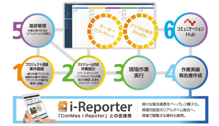 最大の特長としては、当社製品である1,793社以上(2019年11月末現在)の導入実績があるペーパーレス『現場帳票』記録・報告・閲覧ソリューション『ConMas i-Reporter』と簡単な操作で、シームレスに連携することが可能であり、帳票とプロセスが密接に関連する現場の「帳票作成指示、帳票入力、完了報告」などの進捗管理業務の効率化することができます。