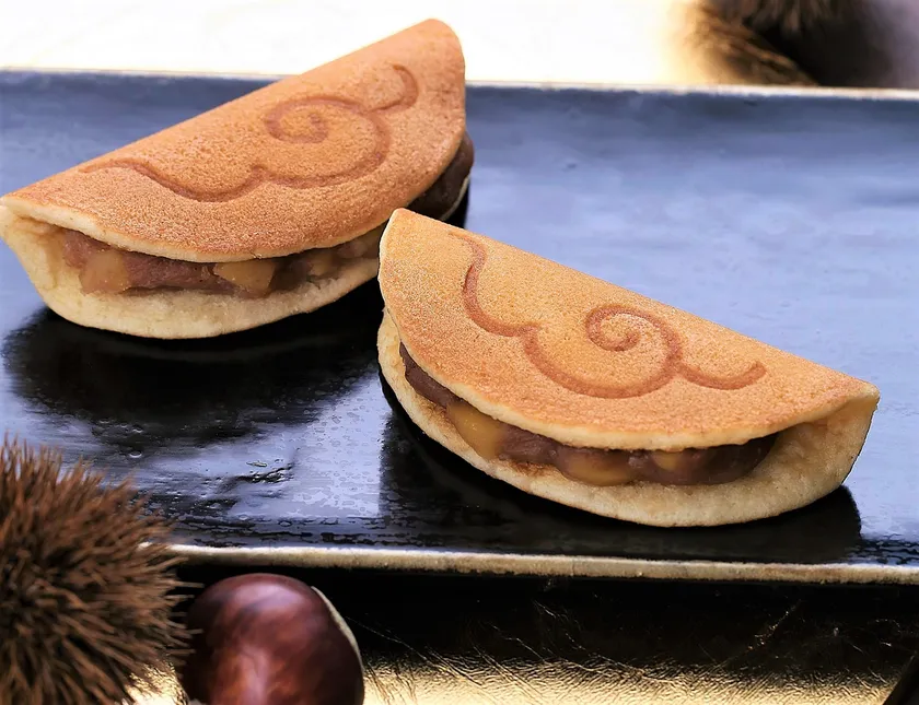 白餡に栗ペーストと粒栗を合わせており、ペーストは熊本産とフランス産の栗を混ぜ合わせることで、栗本来の味と香りを引き立たせています。栗餡を溢れんばかりにたっぷりと包むどら焼き生地は、ふわふわともちもちを同時に楽しめる、まるで雲のような食感です。「羽雲」が青い空を基調としたパッケージデザインに対し、「羽雲(栗)」は黄金色の空に飛び立つイメージのデザインです。