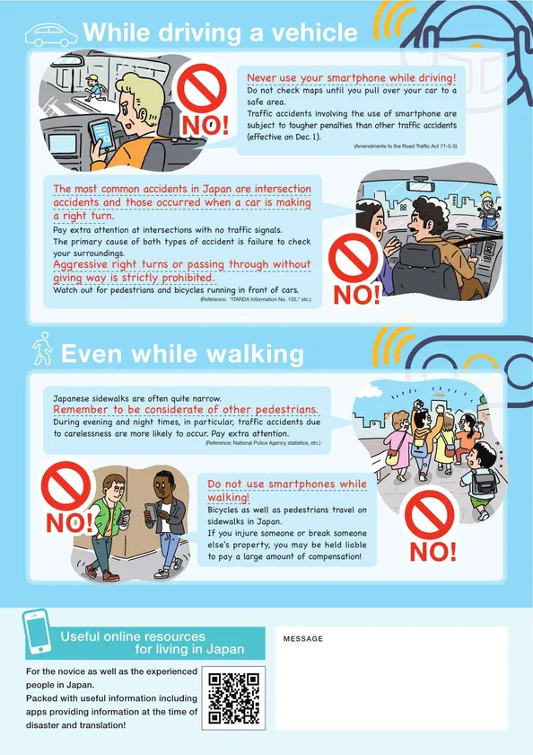 在留外国人向けには、12月から厳罰化された「ながらスマホ」禁止と外国人に多い交通事故のポイント等をまとめた4か国語の啓発チラシ、英語版の「ピカチュウ反射リストバンド」を作成し、外国人居住者の多い自治体等と連携して配布します。