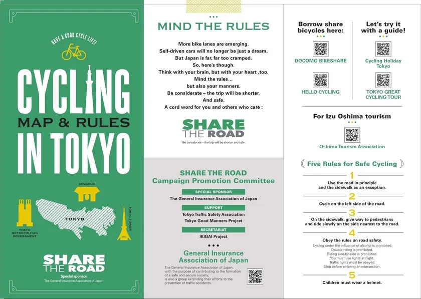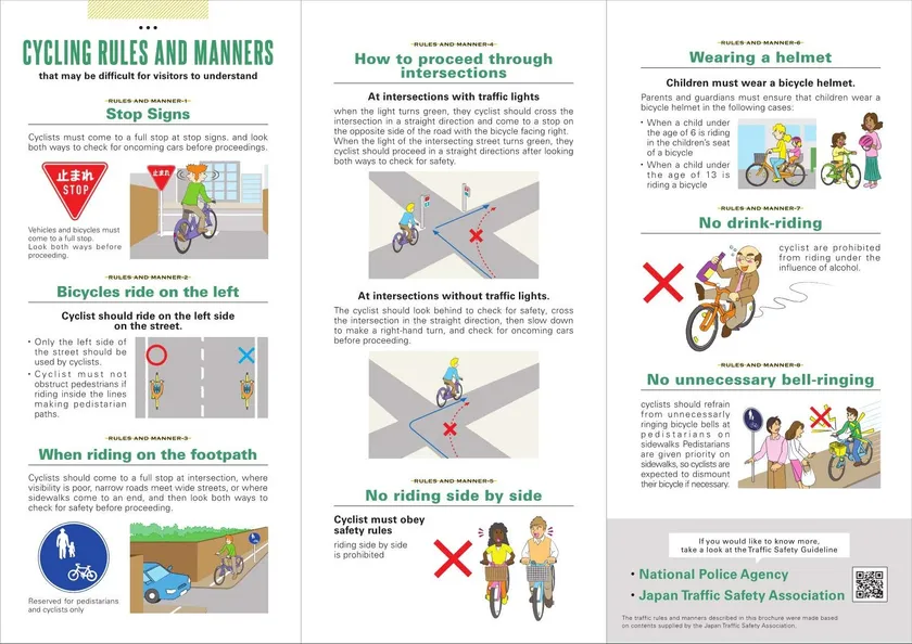 訪日外国人向けには、レンタサイクルやシェアサイクル利用時の自転車の交通ルール・マナー等をまとめた啓発リーフレットを作成し、観光関連団体やレンタサイクル・シェアサイクル事業者等を通じて配布します。
