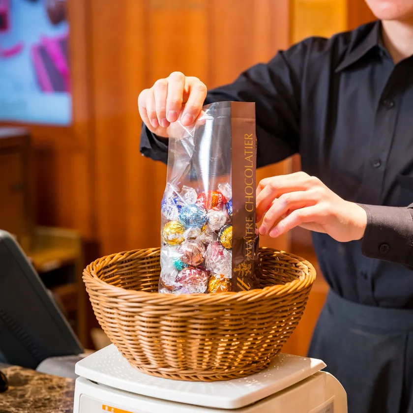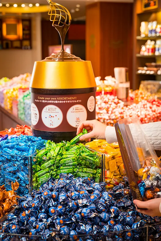 リンツの一番人気チョコレート「リンドール LINDOR」をはじめとする、リンツのバラエティー豊かなチョコレートから、お好きなフレーバーをお好きな量だけ量り売りでお求めいただけるリンツの直営店ならではの販売システム。