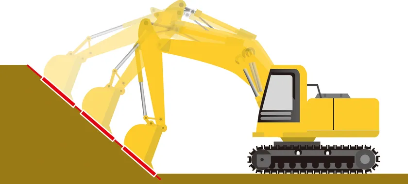 高さ自動制御機能を有効にしたうえで、更にバケット固定機能を有効にすると、アームレバーの操作だけで設計面に対してバケットの角度を固定します。法面の成型、面仕上げなどの作業時間を短縮するだけでなく、仕上げ精度も飛躍的に向上します。