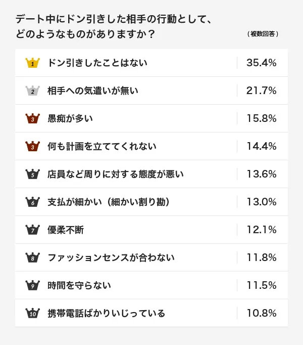アンケートは、「支払が細かい(細かい割り勘)」「挙動不審」「計画を細かく立てすぎている」「何も計画を立ててくれない」「優柔不断」「愚痴が多い」「店員など周りに対する態度が悪い」「テーブルマナー」「車の運転が荒い」「ファッションセンスが合わない」「臭いがキツイ(香水/体臭)」「時間を守らない」「他の異性に興味を持つ」「やたら鏡を見る(髪型やメイクを気にする)」「相手への気遣いが無い」「携帯電話ばかりいじっている」「その他」「ドン引きしたことはない」の18の選択肢の中から複数回答で答えていただきました。それでは早速、結果をご覧ください。