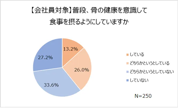 健康寿命に大きく関わってくる骨。会社員は骨の健康を意識して食事を摂っているのか質問しました。「している(13.2%)」「どちらかというとしている(26.0%)」よりも高い割合を占めたのは、「していない(27.2%)」「どちらかというとしていない(33.6%)」でした。会社員の多くは“骨の健康”を意識した食事は摂れていないということが明らかになりました。